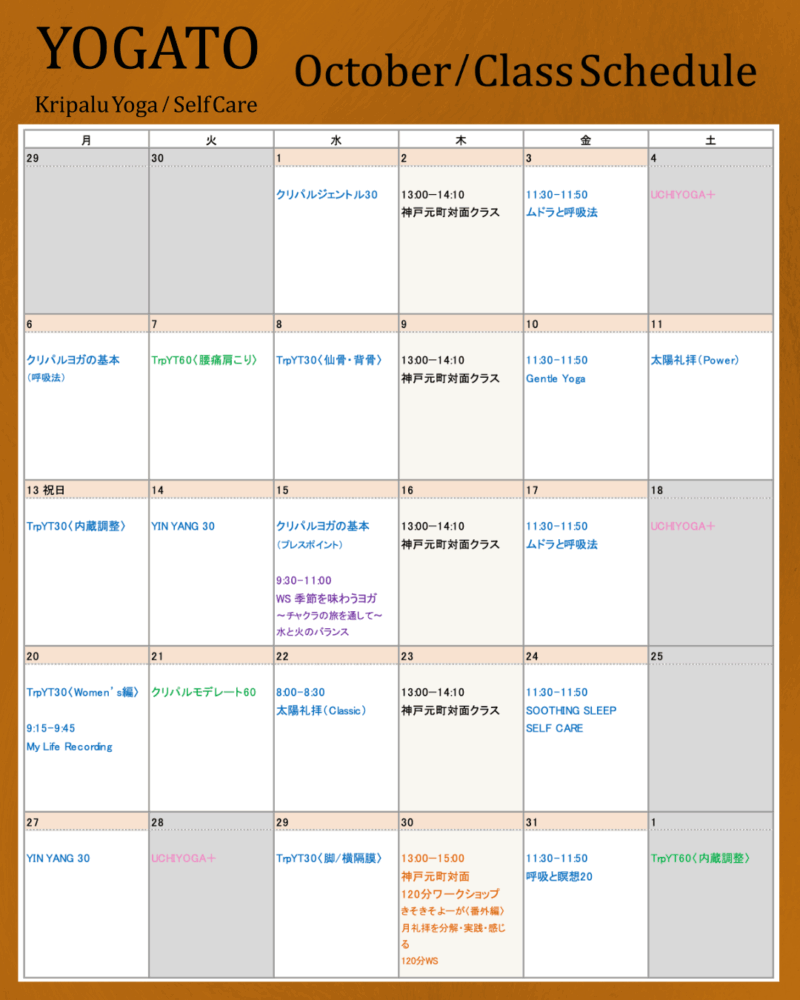 10月のスケジュールカレンダーの時間無記入は全て8時30分スタートです。